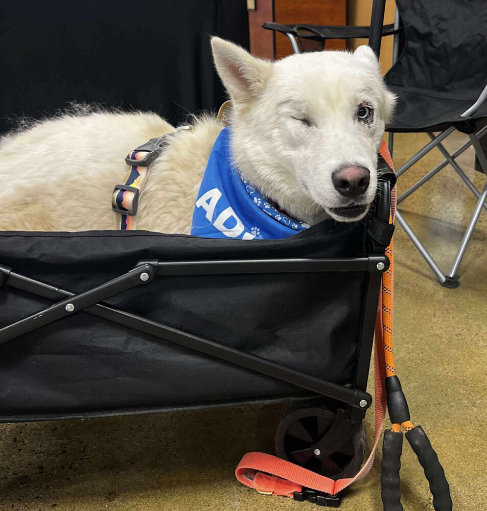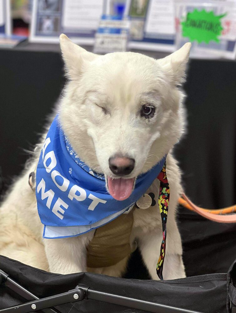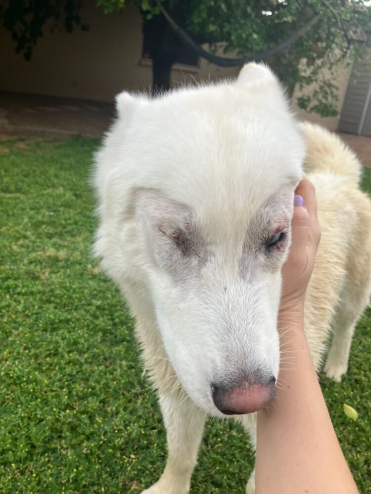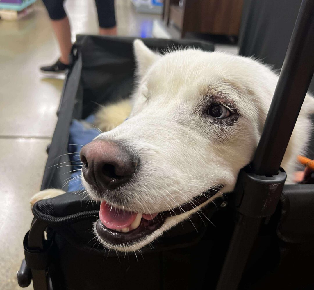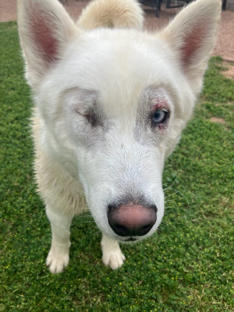 Meet Corvinus! A sweet boy who’s had a rough go and is finally on the road to comfort and love. He was e-listed after struggling to be leashed in the shelter—he was scared and resistant, likely due to untreated pain in his eyes. Once he was out in the yard, he was friendly and couldn’t get enough pets. After arriving in rescue, we had him scheduled for entropion surgery for his eyes (his eyelids were turned inward causing him discomfort). During surgery, the vet discovered a micro-rupture in his other eye that was causing a very slow leak of fluid. She said that this had been ongoing for quite some time and as a result, wasn’t repairable. Because of this, his eye needed to be removed to relieve his pain. Since then, he’s been recovering beautifully and is already acting more like the happy, comfortable dog he was meant to be.